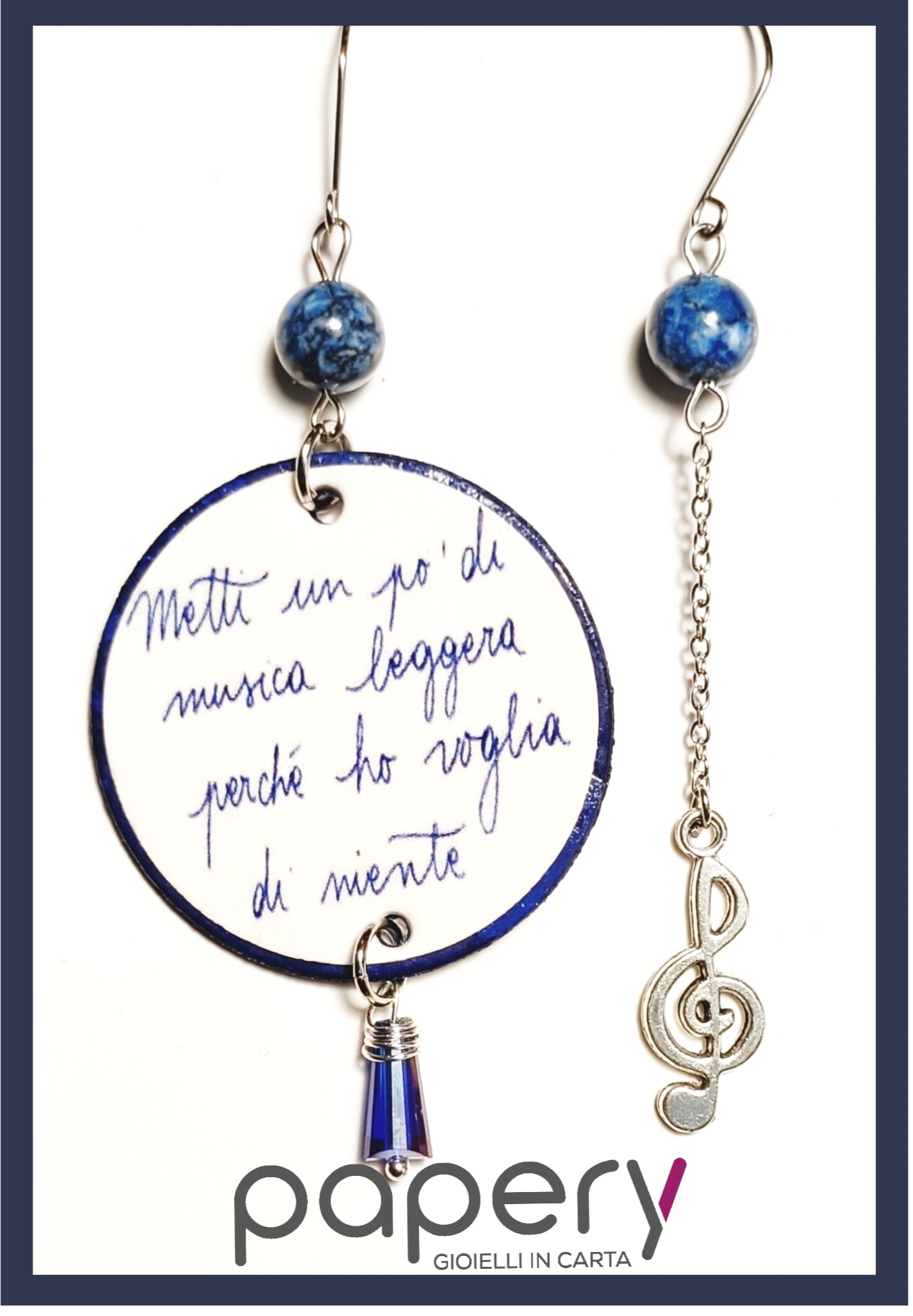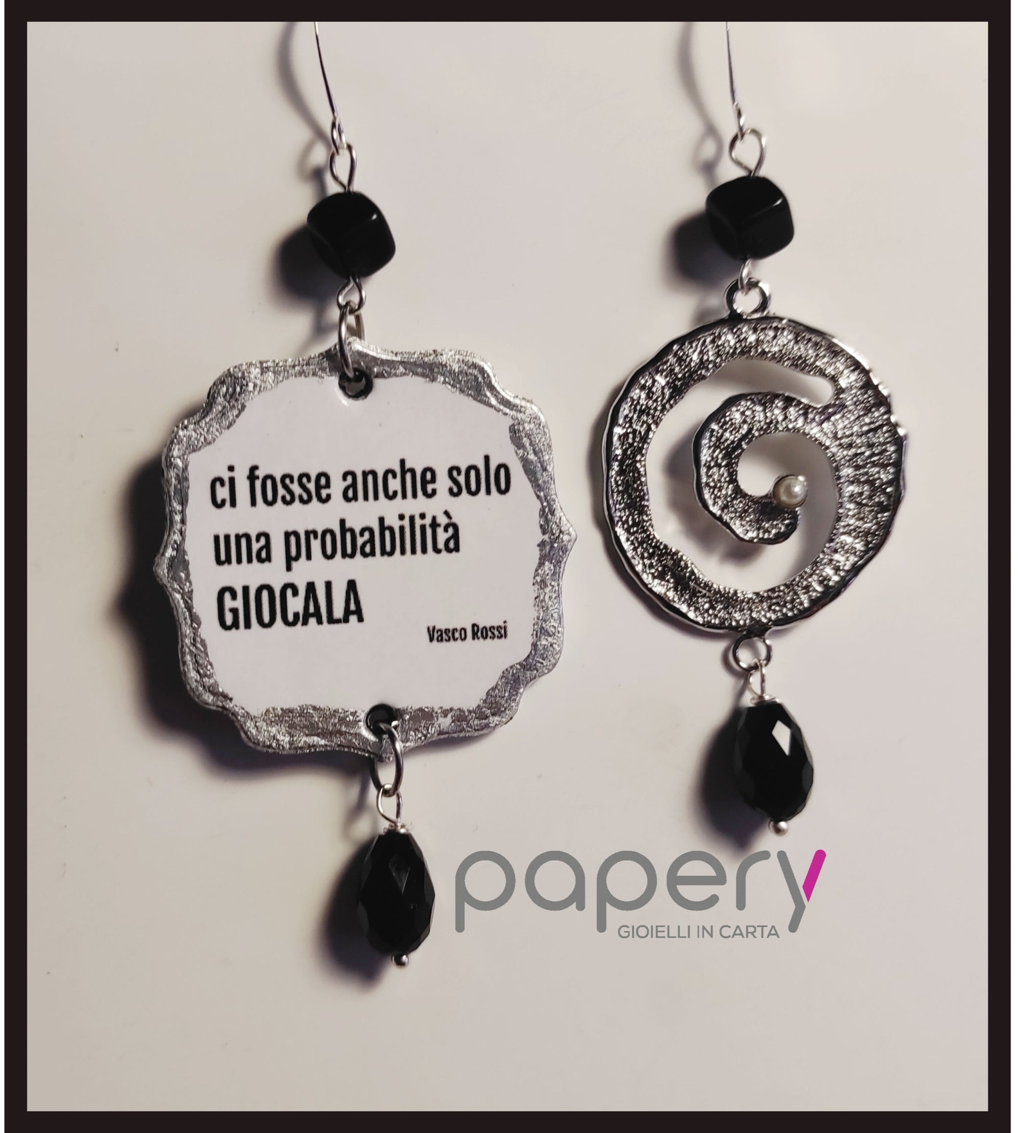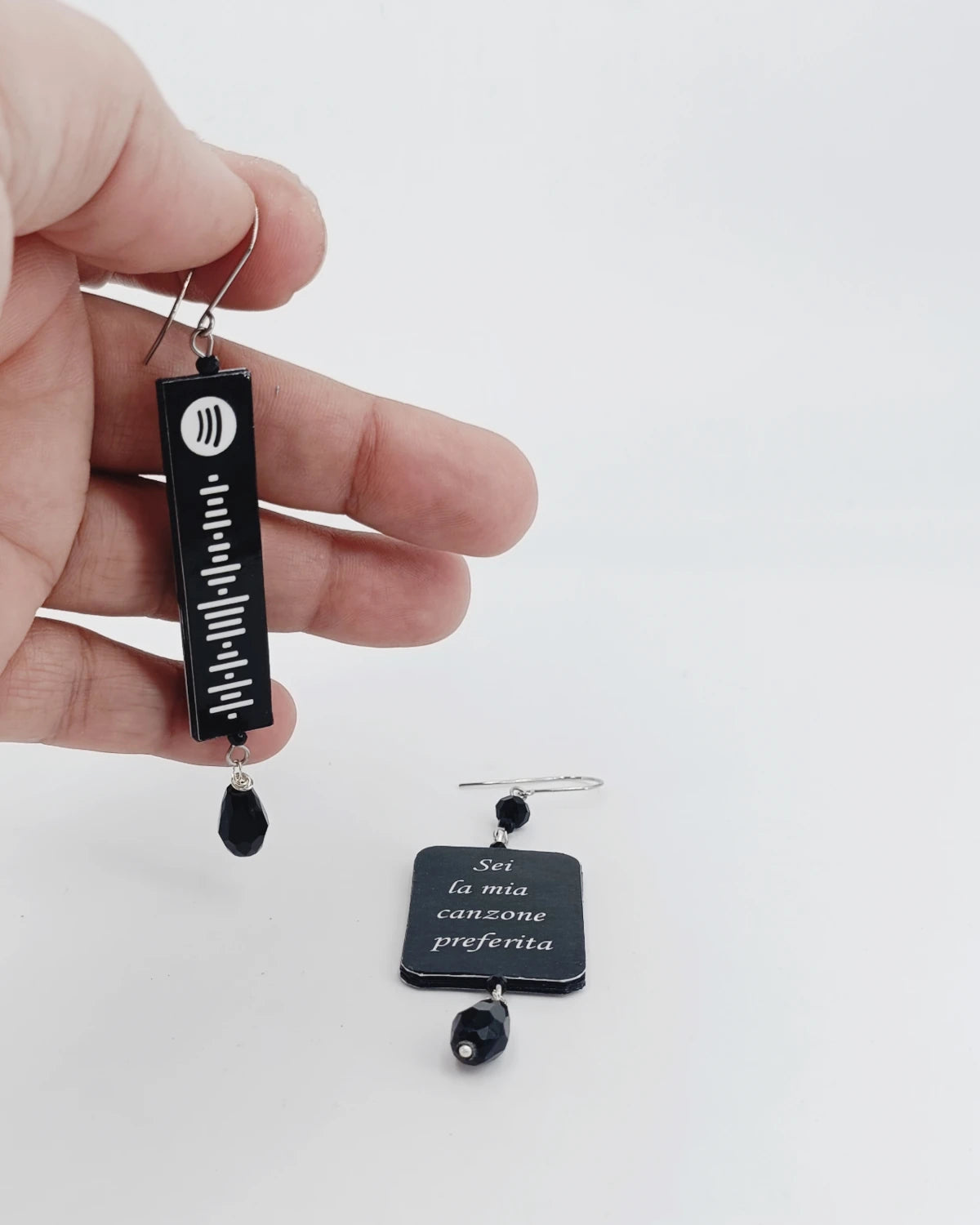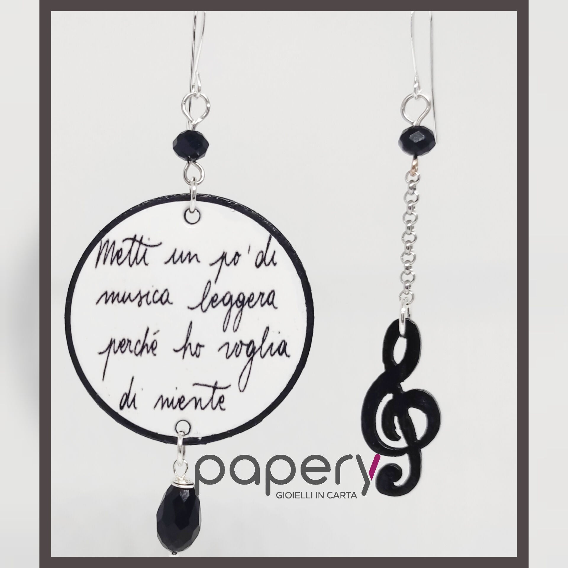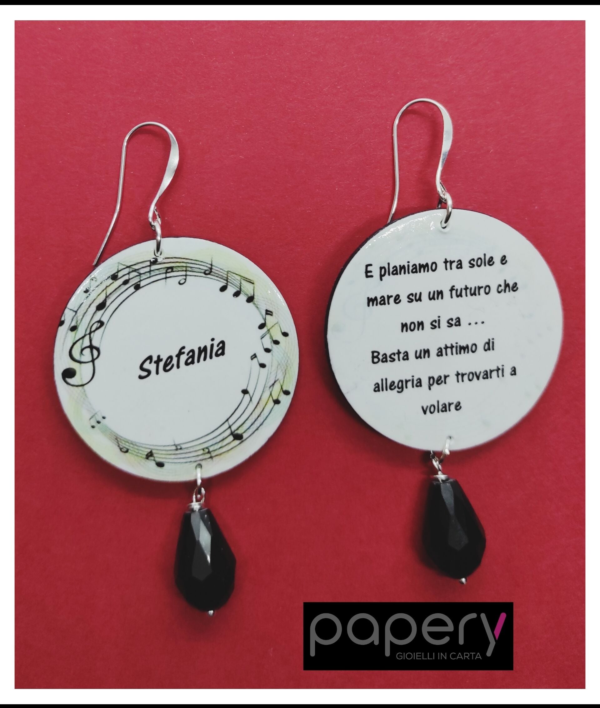 Gioielli e orecchini in carta leggeri e anallergici, con un affascinante effetto legno creato dalla tecnica multistrato. Ogni pezzo è impreziosito da immagini e testi delle tue canzoni e cantanti preferiti, trattato con un lucido protettivo che lo rende resistente alle intemperie.